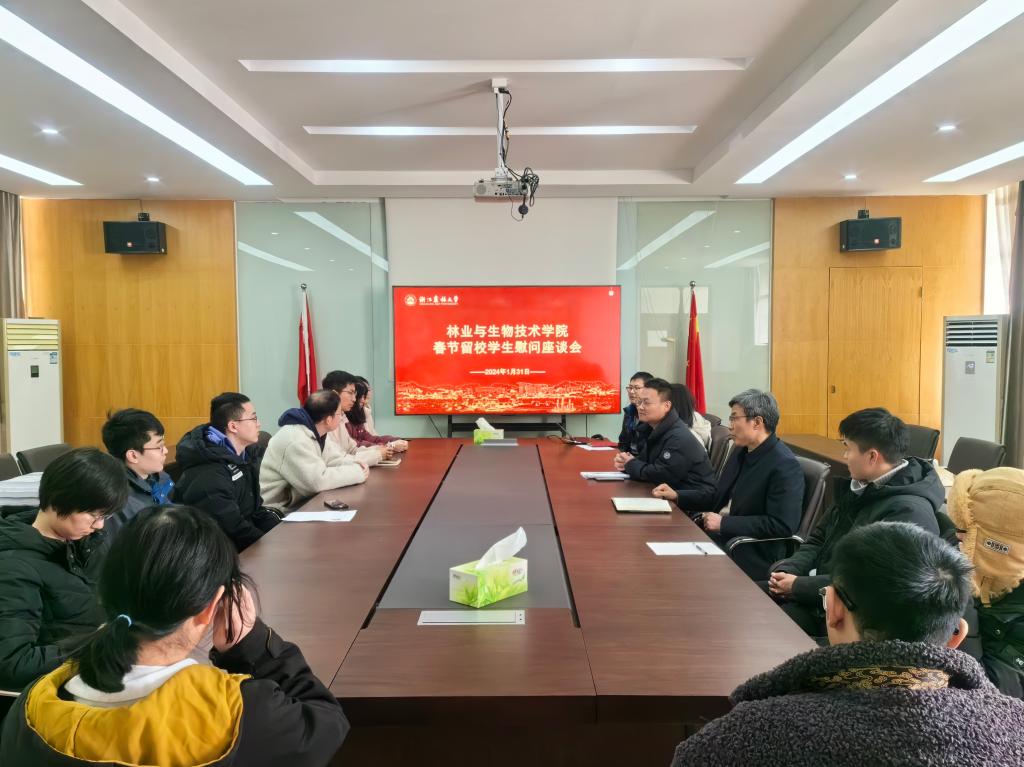 1月31日下午,学院在学6-501组织开展2024年春节留校学生慰问座谈会。学院党委书记郑炳松,党委副书记潘军可,学院辅导员及留校过春节学生参加了此次活动。